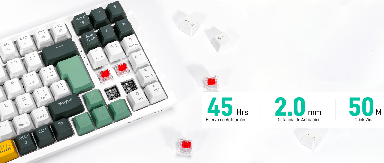 Este teclado mecanico utiliza el switch profesional de Outemu Rojo, de sensación lineal y tacto suave con el sonido más silencioso que switch azul. Recorrido limpio hasta su tope de acción, hace de inmediato en switches bastante fluidos, ligeros. Ideales para juegos, escritura y programación, reduce mucho más fatiga de pulsación.