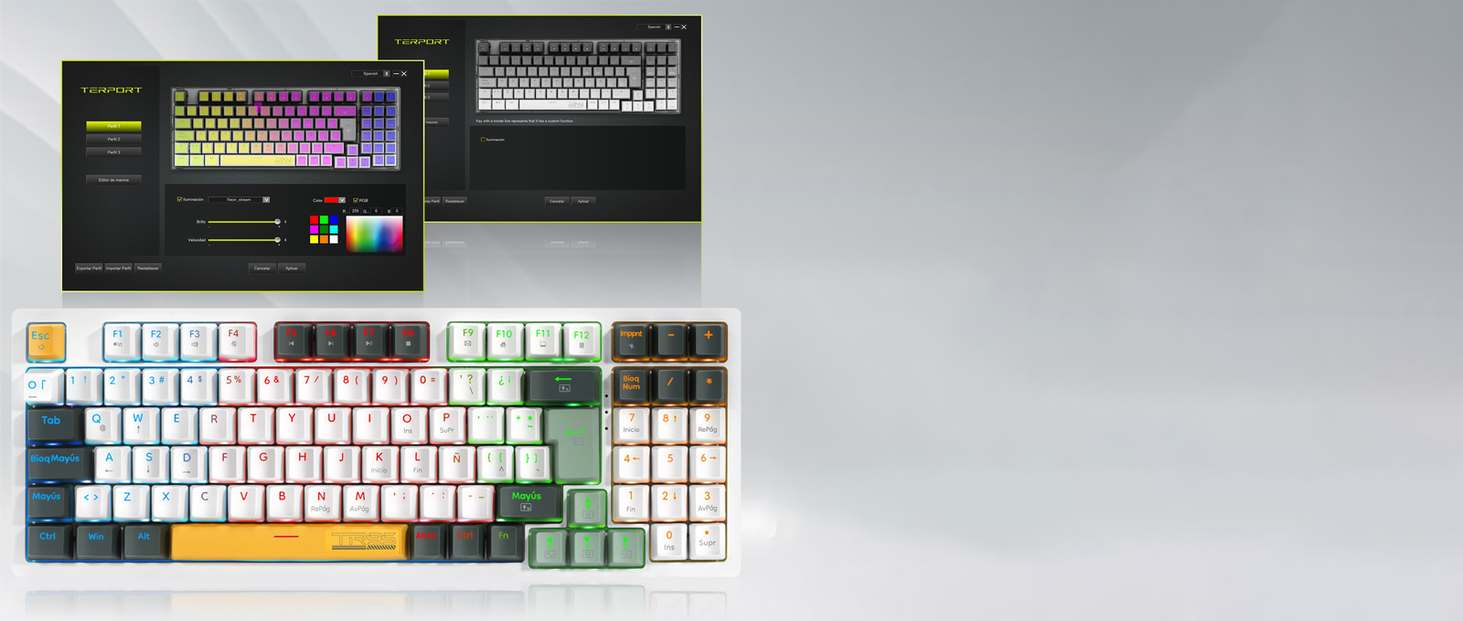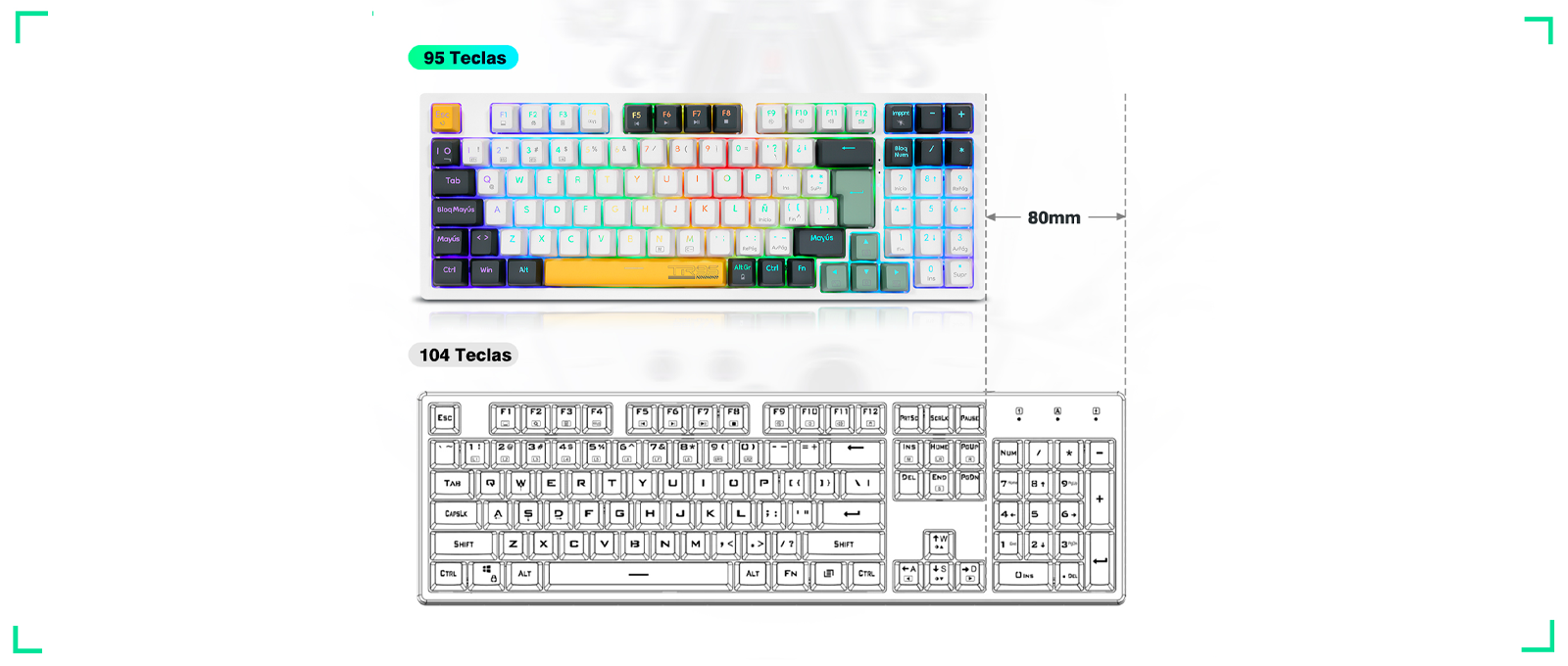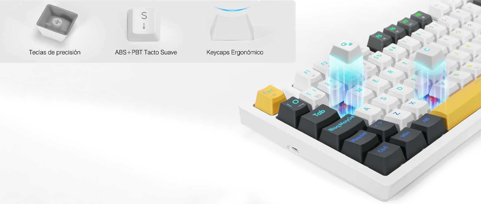 Diseño de teclado pc en idioma español con la tecla Ñ, que es conveniente para usuarios que usan caracteres españoles. Las teclas moldeadas por inyección dual brindan una retroiluminación clara y uniforme y curvas ergonómicas para garantizar que las letras no se rayen.