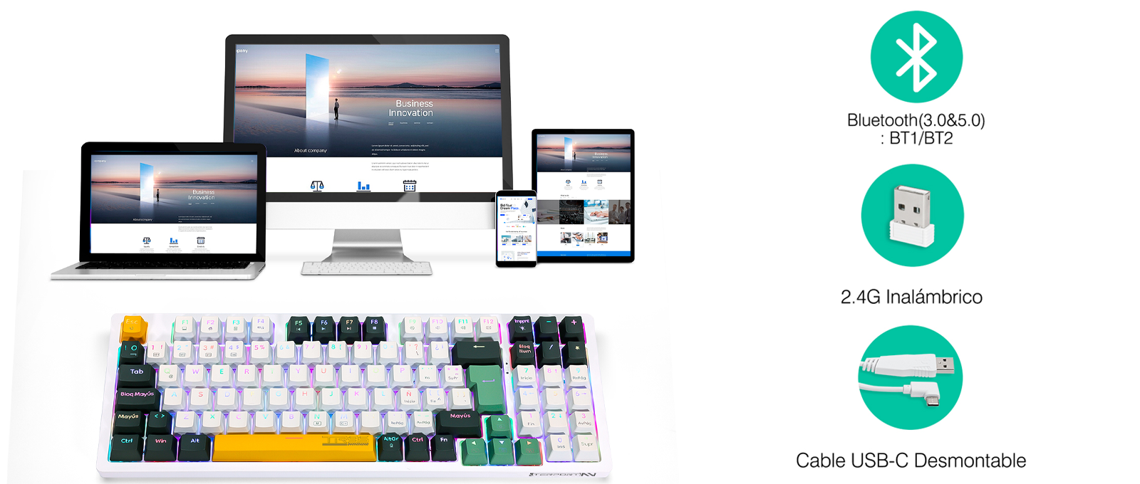 Este teclado inalámbrico recargable cuenta con tres modos de conexión: Bluetooth/2.4G Usb/Cableado. Un click rápido al botón abajo y podrá conectarse al dispositivo rápido. Cabe mencionar que el modo de bluetooth permite conectarse hasta tres dispositivos a la vez y se puede cambiar entre dispositivos libremente.