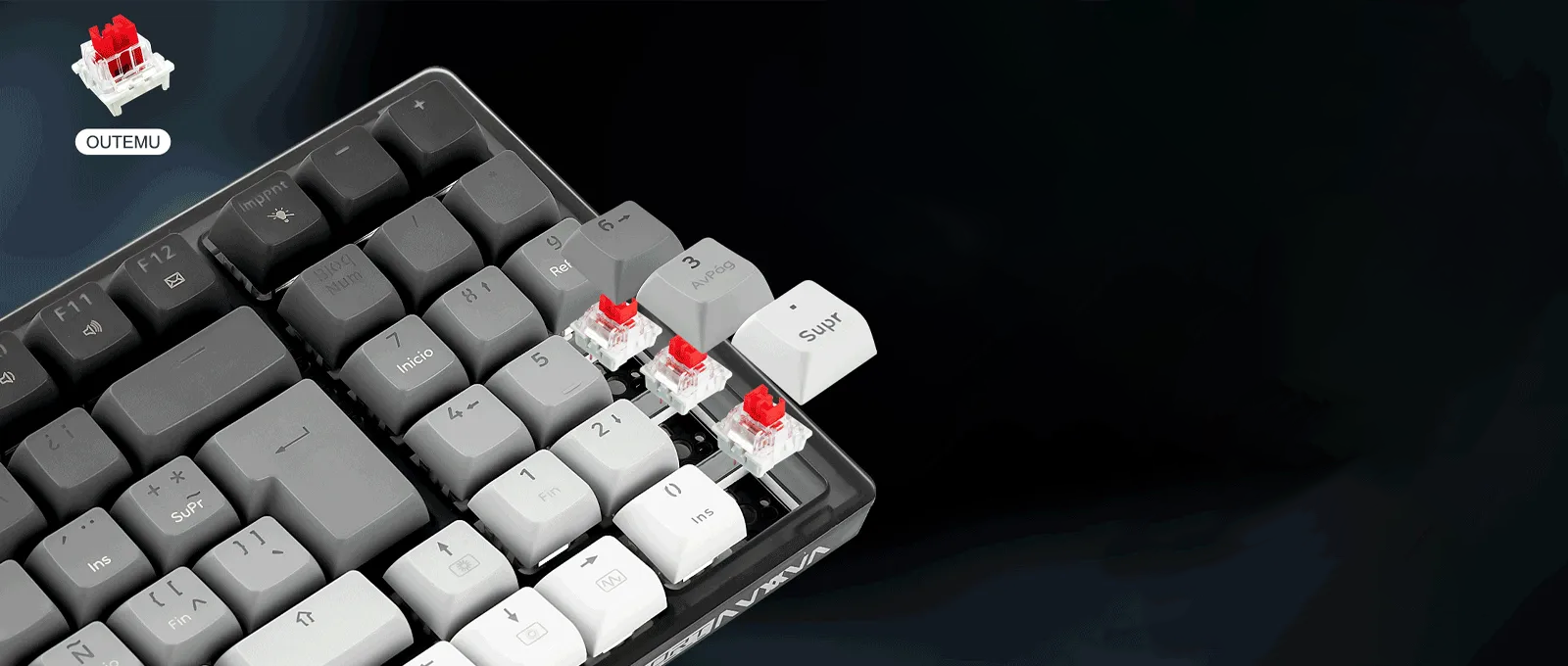 La base del teclado es transparente, y la parte interior contiene una capa de espuma que reduce el ruido del teclado, por lo tanto, es una excelente opción para personalizar el teclado que quieres. Utiliza switch profesional de outemu red, su parte arriba es compatible con teclas con la forma “+” en la parte inferior. Las ranuras del teclado son de casquillos hot-swap, compatible con switches de 3-PIN/5-PIN. Fácil de cambiar switches por el extractor de switch simplemente.