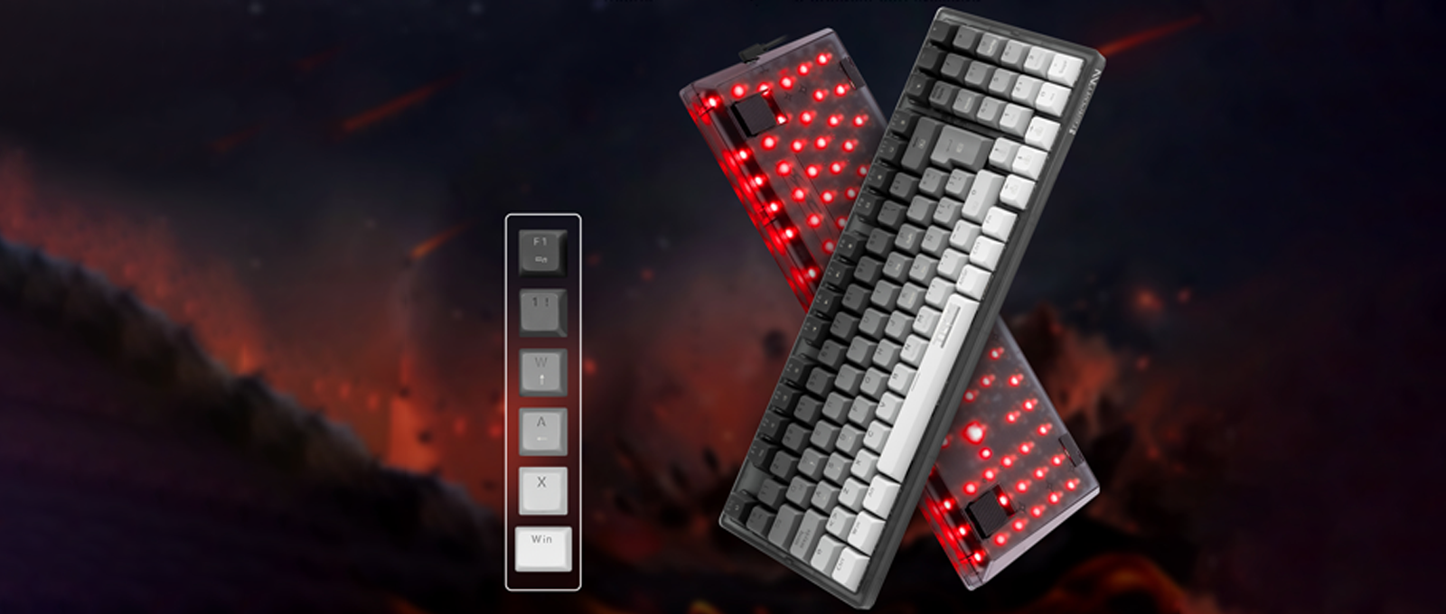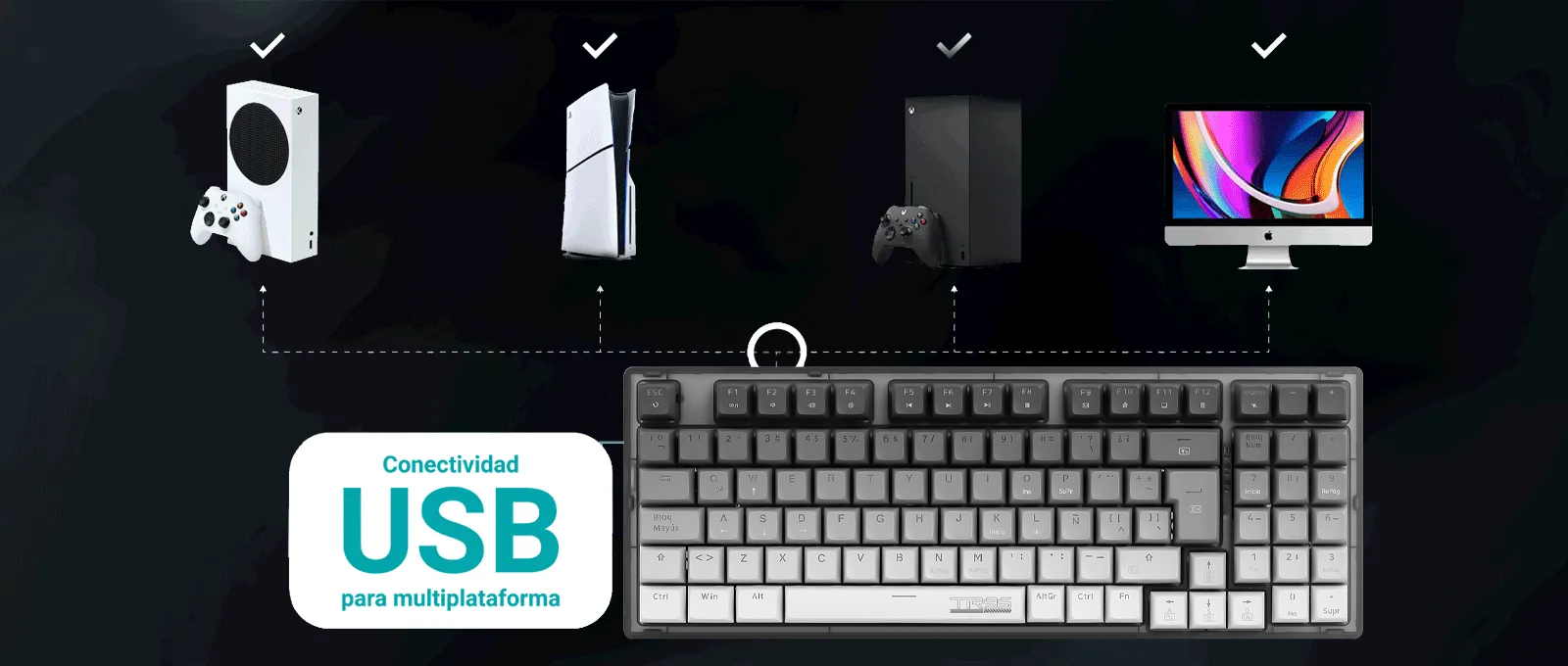 Tamaño más compacto y popular de 90%, conservan la zona de flechas y números, lo que lo vuelve más conveniente tanto en juegos como en escritura diaria. Además, con las 95 teclas antighosting en español latinoamericano, el teclado será más útil y eficiente para nuestros usuarios.