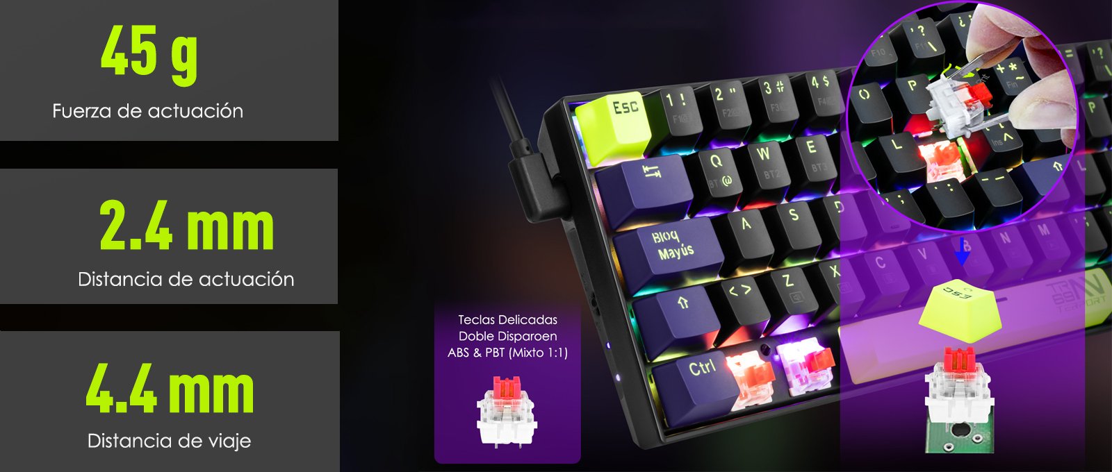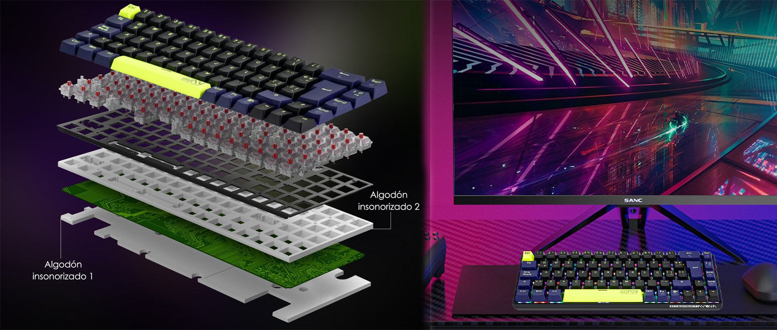 Nuestro teclado mecánico Incorpora una almohadilla de algodón de doble capa que minimiza el ruido. Esta característica suprime vibraciones y mejora la experiencia de escritura. Ideal para entornos donde el silencio es importante, como oficinas o estudios compartidos.