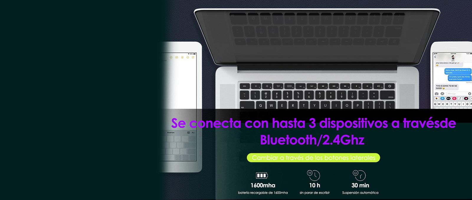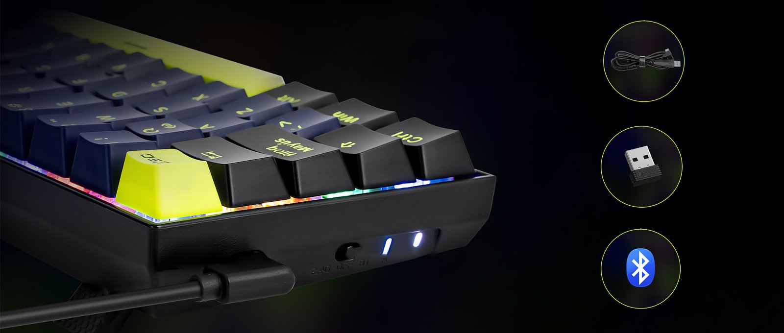 Este teclado mecánico te ofrece conectividad flexible con Bluetooth, USB 2.4GHz y un cable Tipo C. Cambia fácilmente entre dispositivos como laptops, tabletas y teléfonos. La conexión inalámbrica brinda libertad de movimiento, mientras que el cable de 150cm permite cargar y usar simultáneamente.