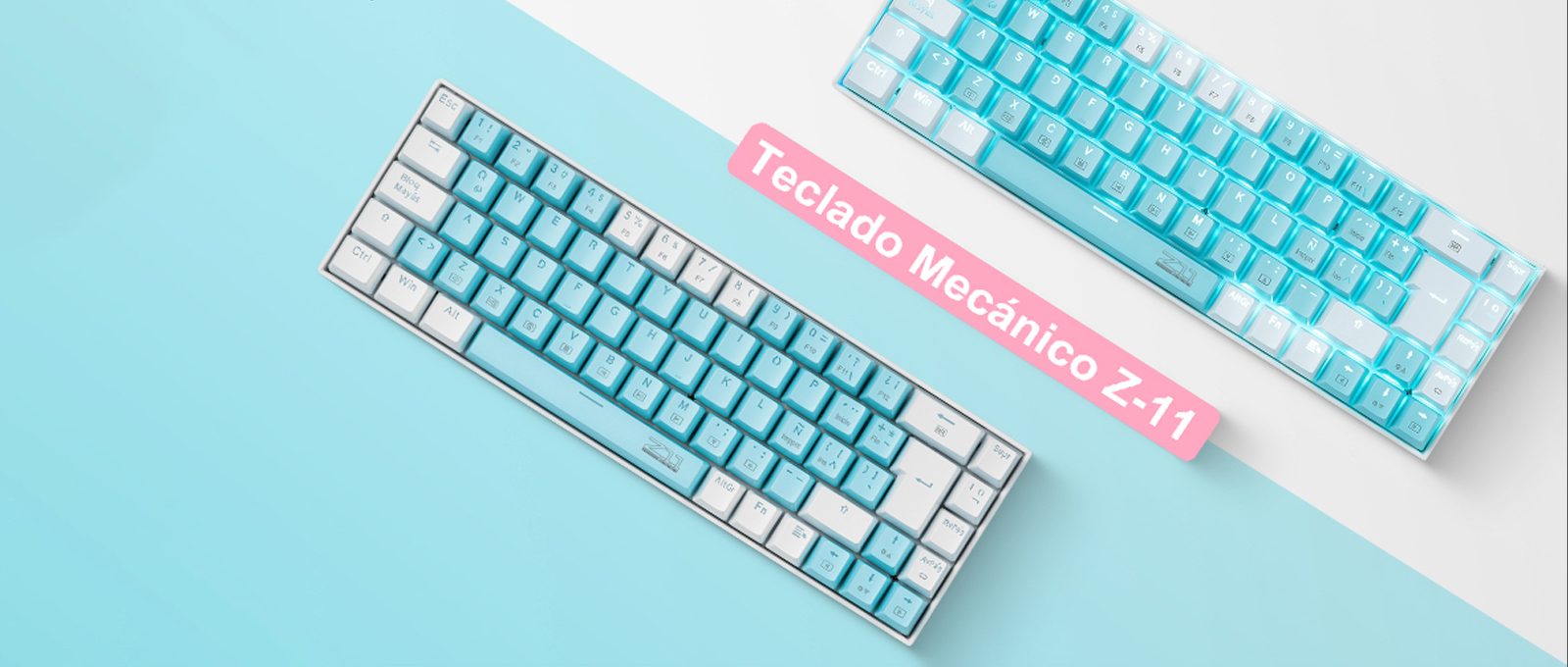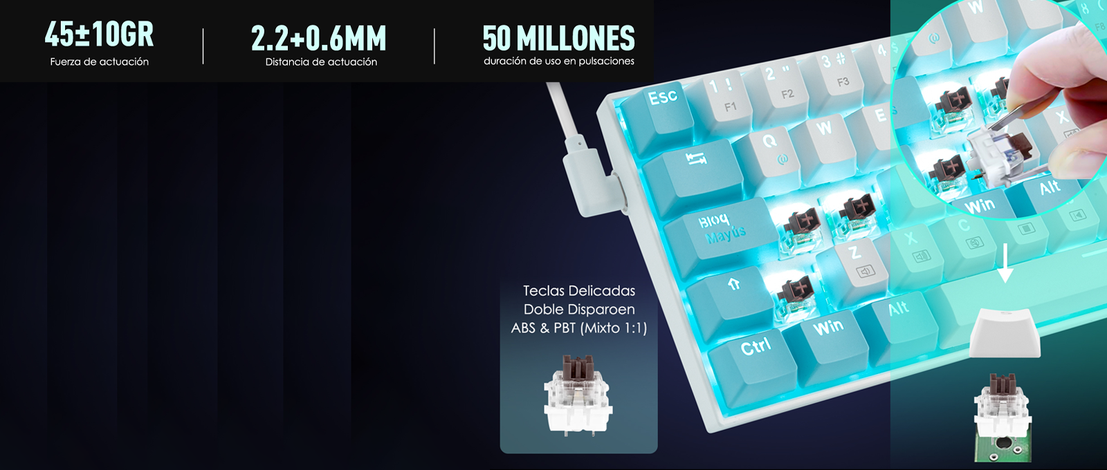 Este teclado mecánico usa teclas de doble inyección, se aplican material ABS+PBT 1:1 mixto, que garantiza una superficie difícil de dejar huellas y un color fabuloso. Los colores combinados Azul+Blanco+Rosa(se regala dos teclas rosas), te brindarán un estado de ánimo más agradable durante los juegos o el trabajo.