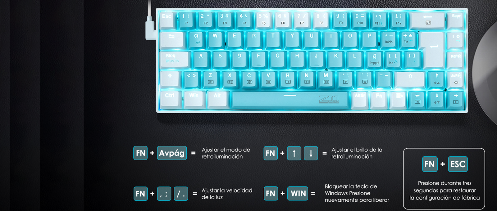 Este teclado gamer cuenta con 18 tipos de efectos de retroiluminación azul ajustables mediante Fn+Repág, brillo de retroiluminación ajustable con Fn+flechas. Puedes programar todas las teclas para que sean del mismo color o del color que desee sin necesidad de controladores.