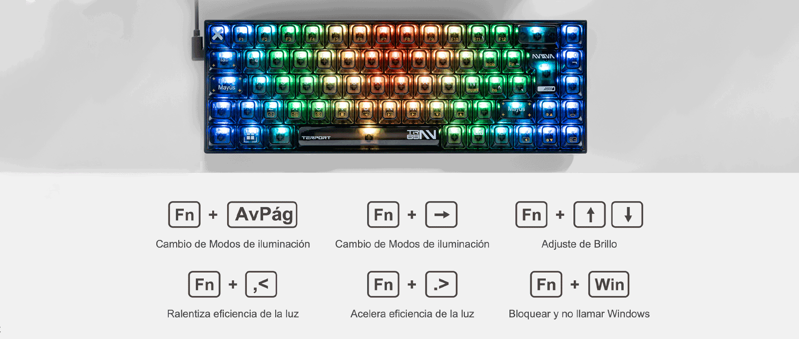 Se trata de un mini teclado gamer de tamaño 65%, compacto y portátil. Con la tecla Fn podrá aplicar cambios y funcionamientos en el teclado y el sistema de idioma español latino le ayudará a escribir fácilmente. Este teclado español Terport TR69, es un teclado ligero y elegante perfecto para un uso eficaz del espacio.