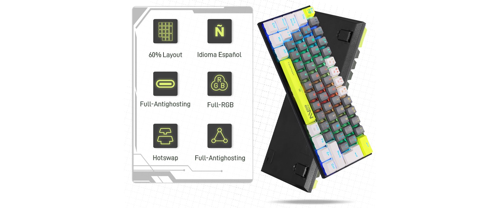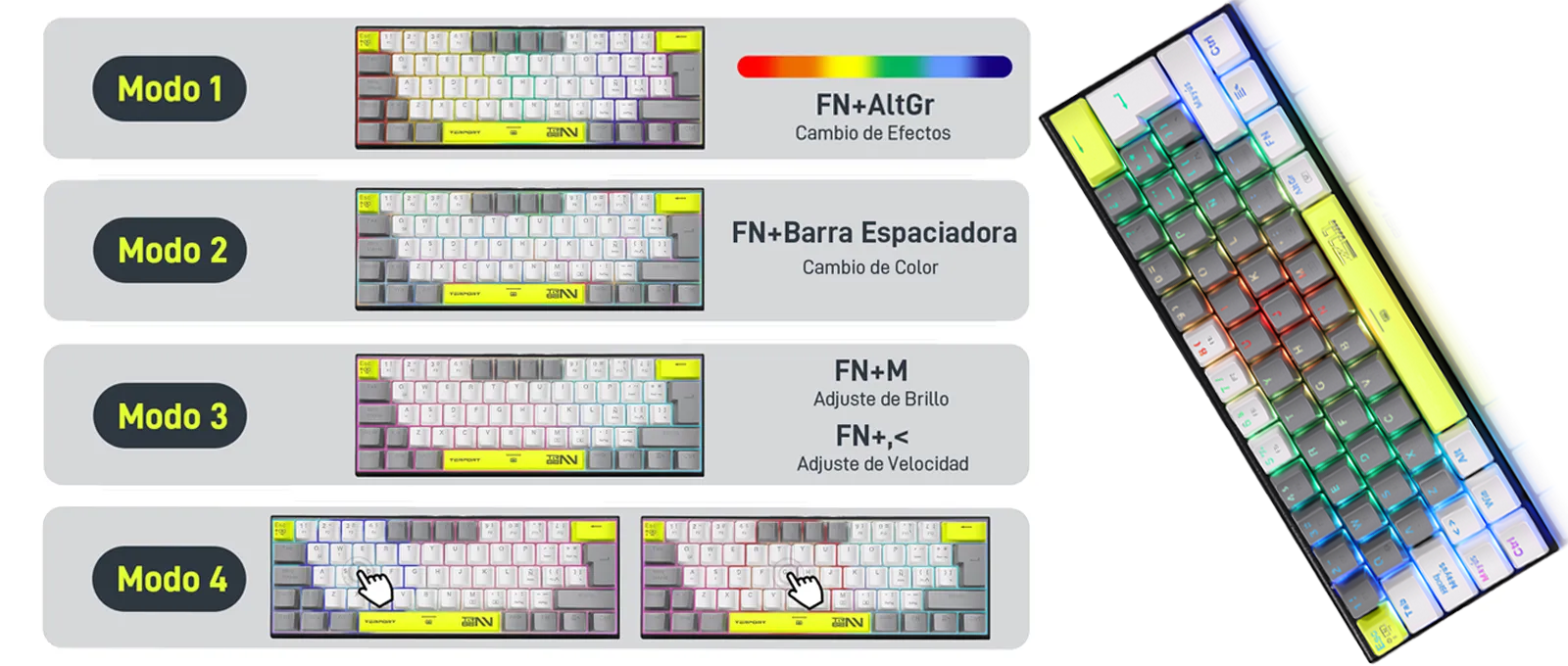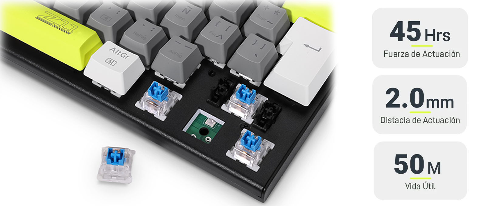 El teclado mecánico usa switch profesional de outemu rojo, de sensación lineal con un recorrido limpio hasta su tope de acción. Ideal para juegos o escritura que requieren de una alta velocidad de respuesta y pulsaciones rápidas. Cabe mencionar que soporta switch hotswap de 3-pines.